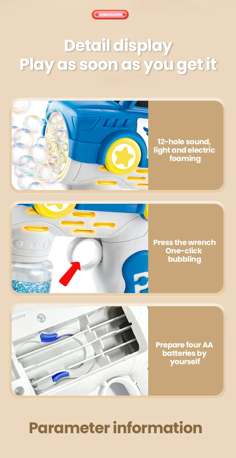 Functions: Lighting / Sound Effects / Bubble Blowing