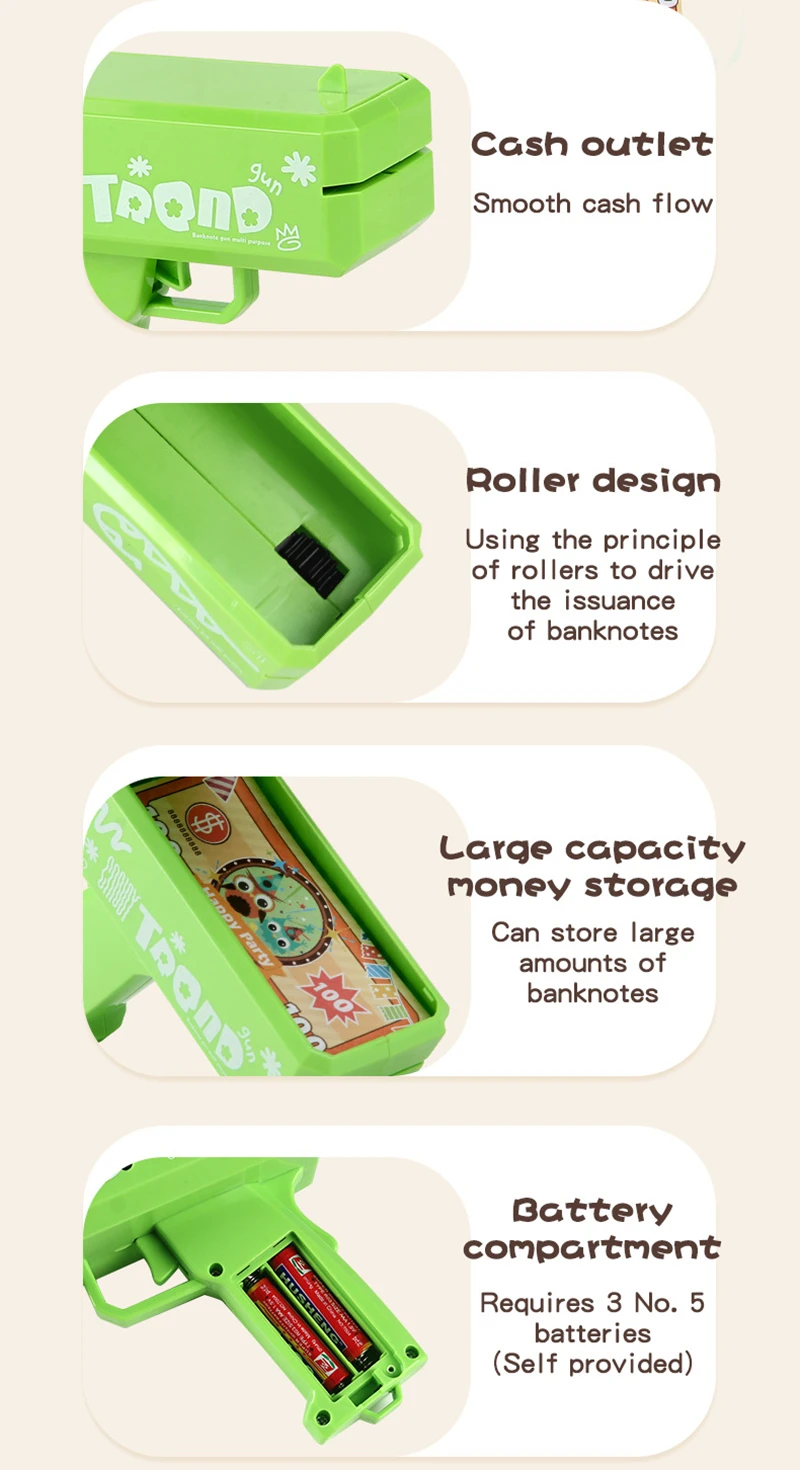 Are you still looking funny toy for party? Then you must not miss our product! Made of durable material, this money shooter toys is easy to play, and durable for using. Great as party toys to share with your family and friends.